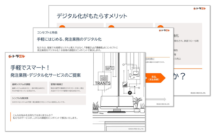 「トラミル」は、複雑で大規模なシステム導入ではなく、“手軽さ”と“柔軟性”をコンセプトに、発注業務をデジタル化!お客様の課題をピンポイントで解決します。